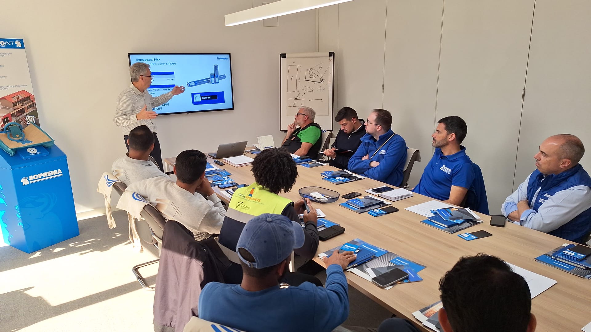 Durante a formação, foram apresentadas as principais vantagens do sistema SOPRAGUARD, destacando-se como uma solução de elevada fiabilidade e com forte potencial de valorização para aplicadores e distribuidores: