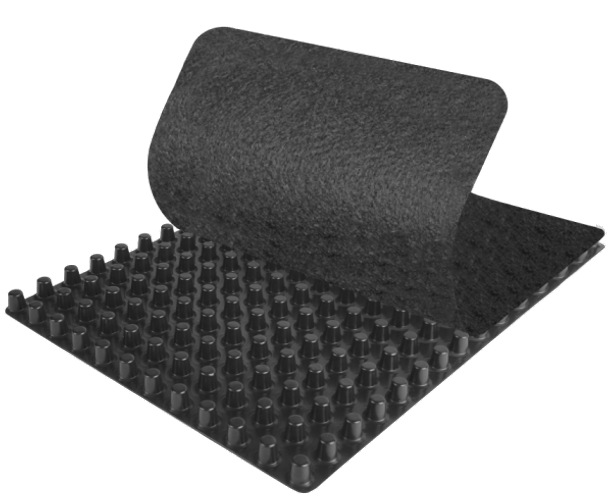Membrana drenante composta por uma estrutura tridimensional de poliestireno HIPS não perfurado incorporado com um geotêxtil de polipropileno numa das faces. Altura aproximada de 13 mm.