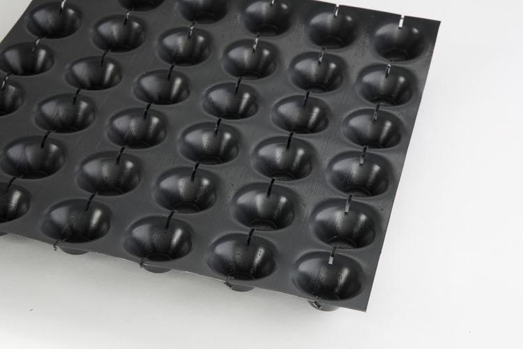 Membrana drenante alveolar de polietileno de alta densidade (HDPE) com canais de escoamento, para coberturas ajardinadas.