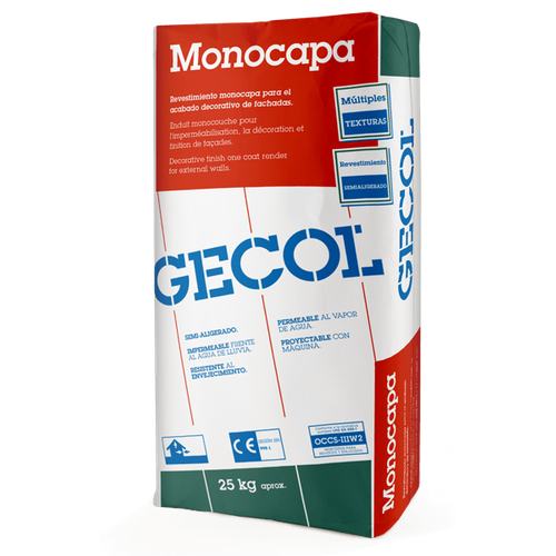 GECOL Monolayer é uma argamassa de revestimento de camada única colorida em massa projetada para a decoração, renovação e impermeabilização de fachadas.