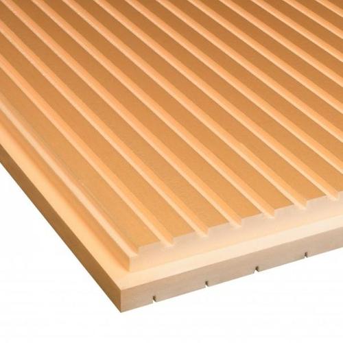 Placas de espuma rígida de poliestireno extrudido (XPS) de célula fechada com superfície canelada e acabamento lateral com secção em meia madeira para coberturas inclinadas.